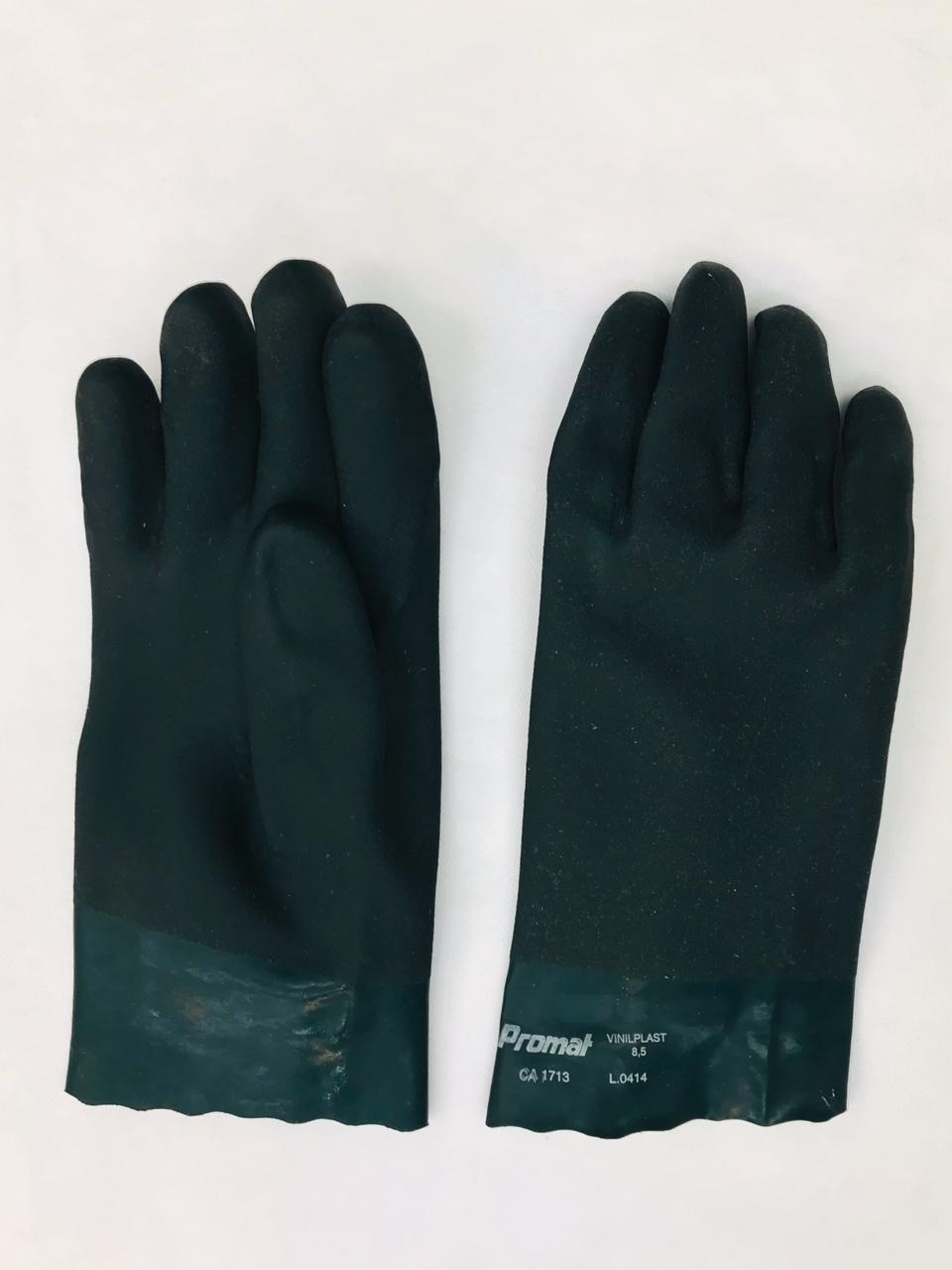 Luva confeccionada em malha de suedine de algodão com revestimento em pvc na palma, dorso, dedos e punho e acabamento áspero.